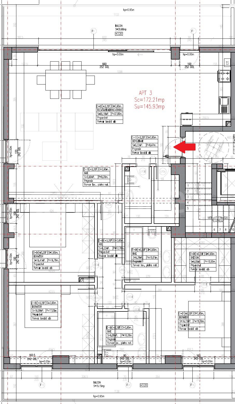 It is composed of 65,5sqm generous day area with living room, dining area and kitchen, 22sqm terrace with view to Herastrau Park and French Village, shower toilet, storage, 17sqm master bedroom with en-suite bathroom and dressing, 2 secondary bedrooms (16sqm each) sharing one full bath and 15sqm terrace.