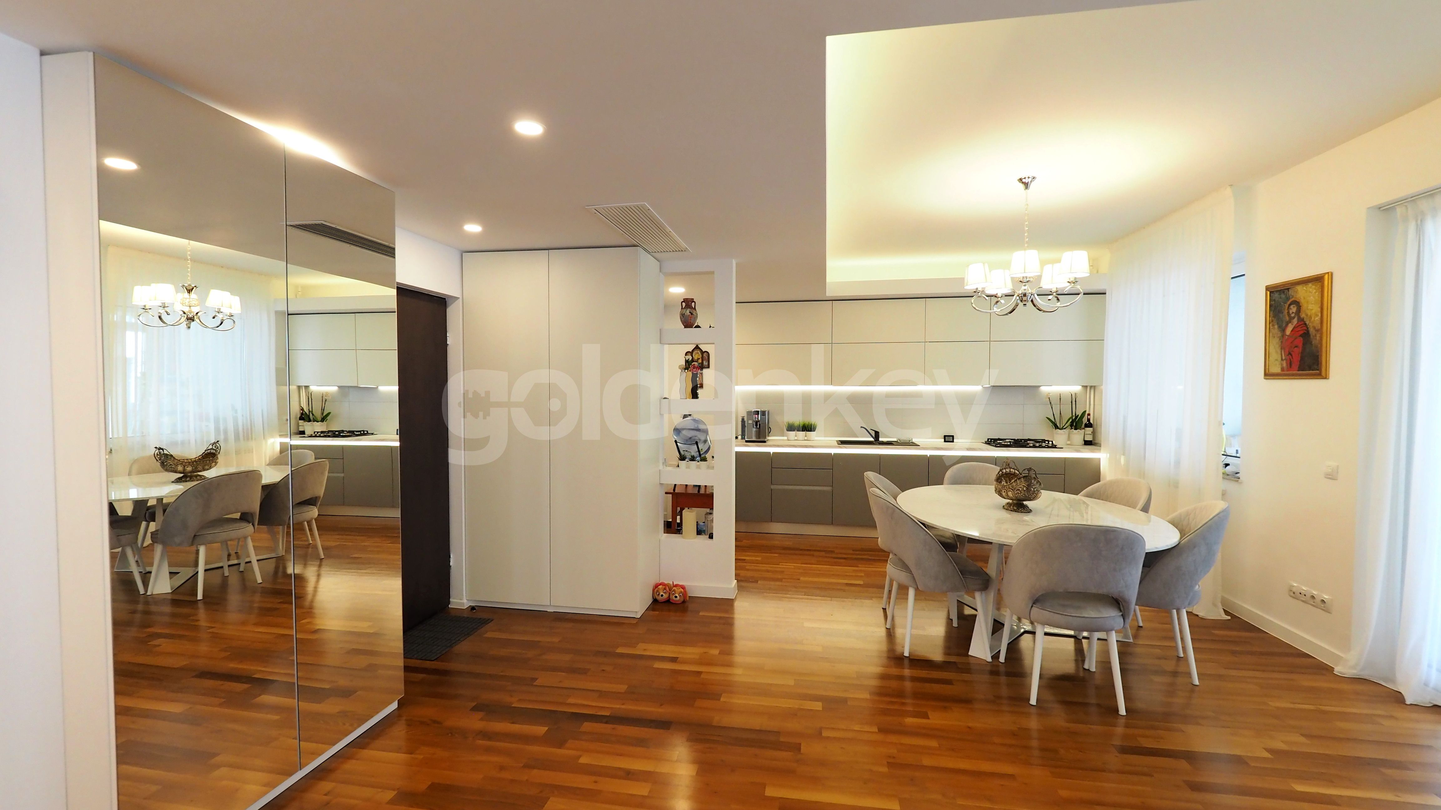 Given the generous space, the facilities of the building and the proximity of the Herastrau Park, this apartment is suitable for a family with children.