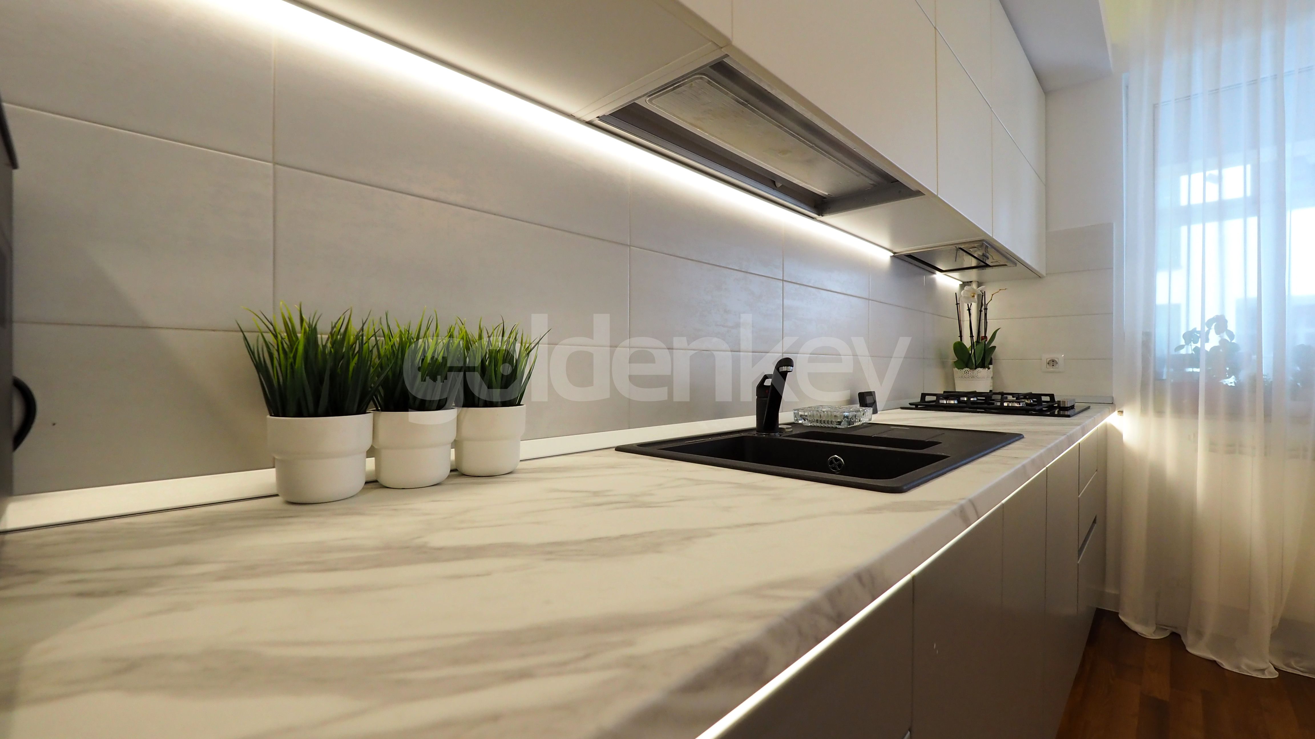 The finishes are of good quality (Alumil aluminum windows, Bauwerk parquet, Italia doors, Karag-Sanindusa sanitary).