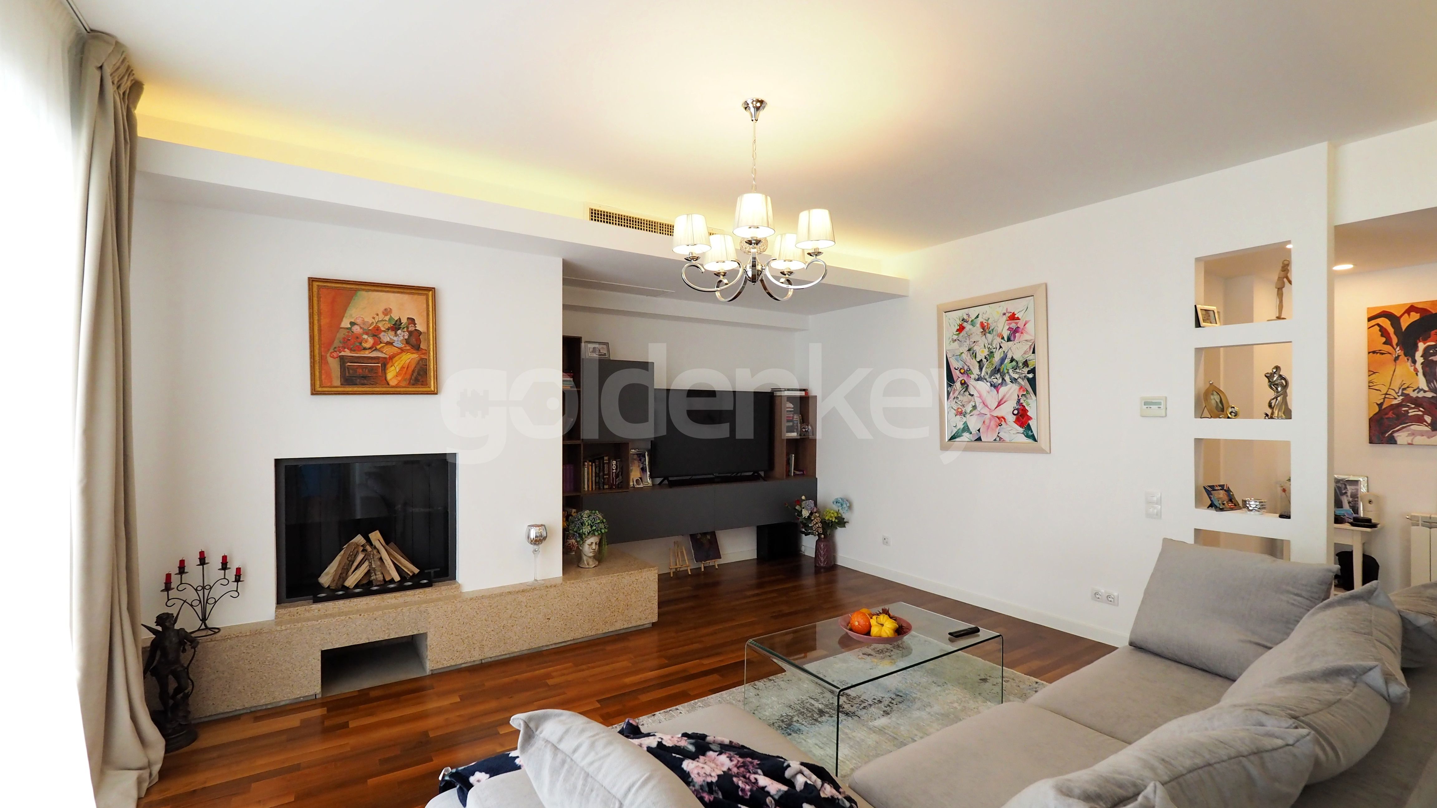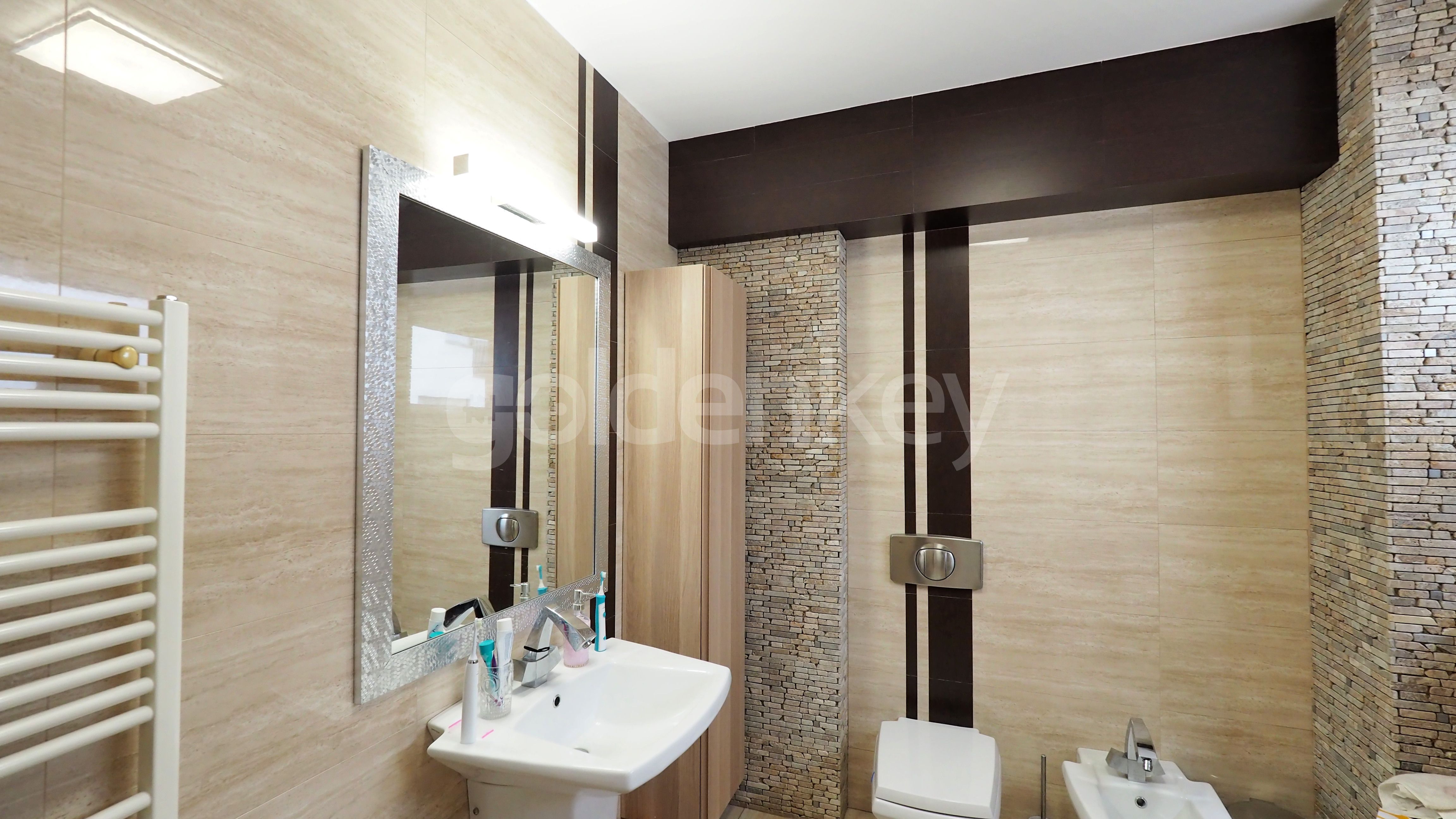 It consists of the 56.5sqm day area with spacious living room with fireplace, dining area and fully equipped Whirlpool kitchen, generous terrace of 16sqm, matrimonial area of 37sqm composed of bedroom with en-suite bathroom with bathtub and dressing room (can be splitted in 2 bedrooms), secondary bedroom 17sqm with dressing room and bathroom with shower.