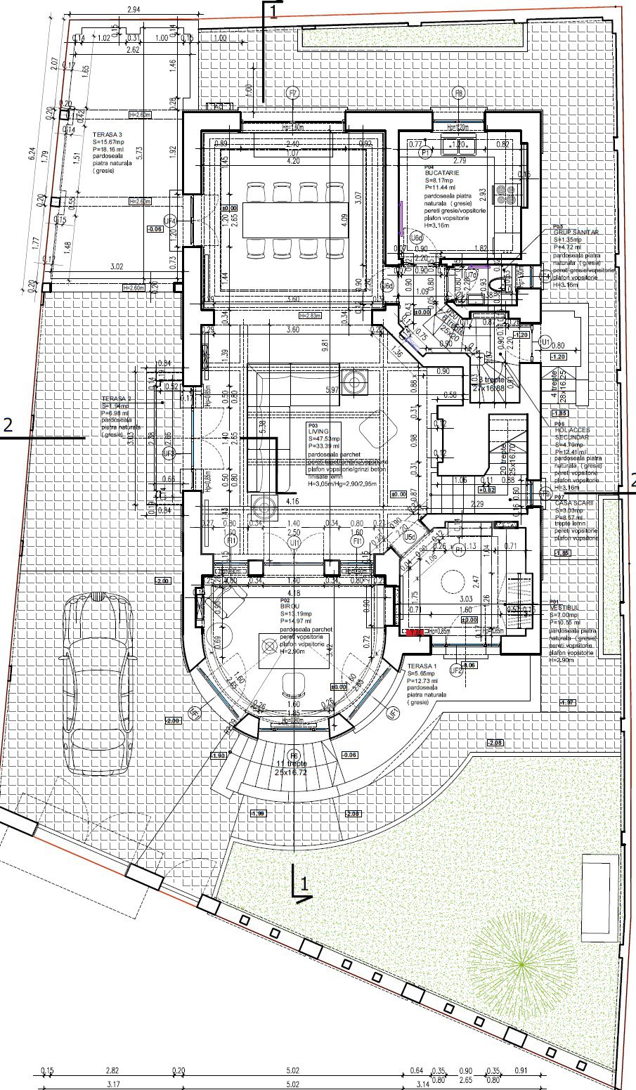 Are garaj atasat, 2 locuri de parcare in curte si inca 3 locuri in fata vilei. Sunt 2 intrari separate, demisolul putand fi folosit ca un apartament individual.