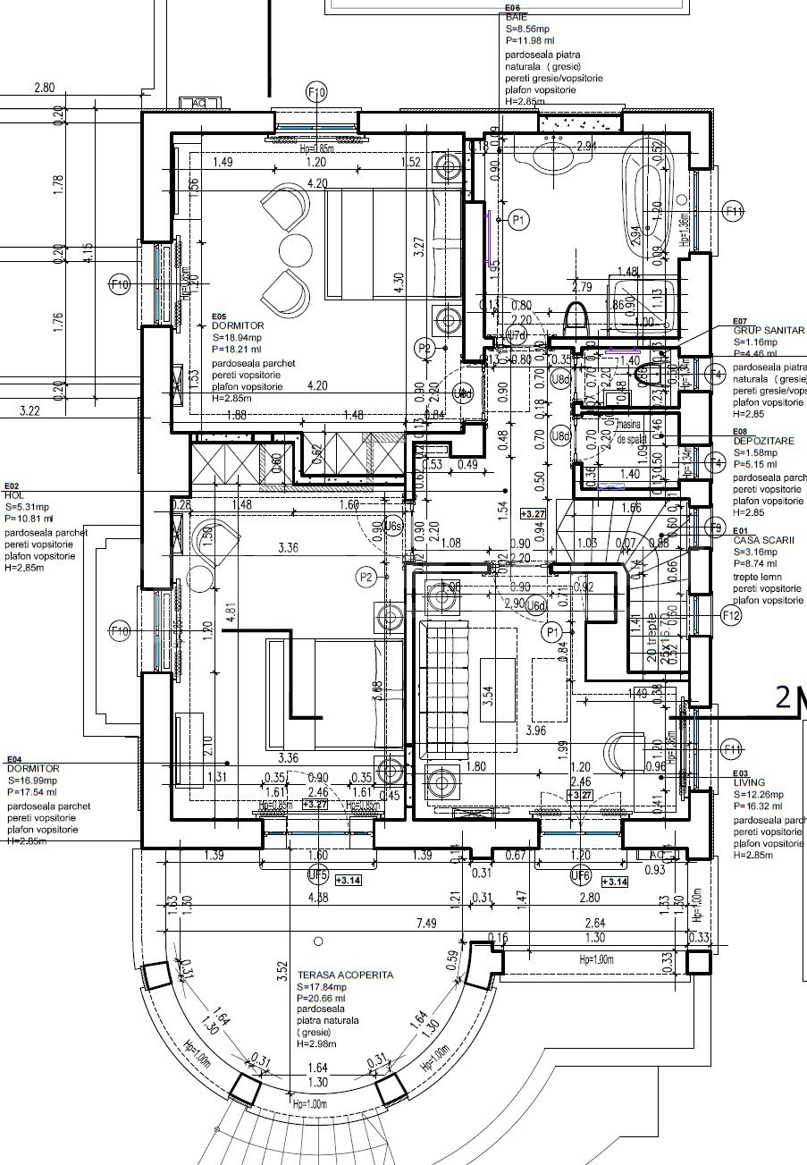 La etaj sunt 3 dormitoare (19/17/13mp) care impart o baie mare cu cada si dus, grup sanitar si terasa de 18mp.