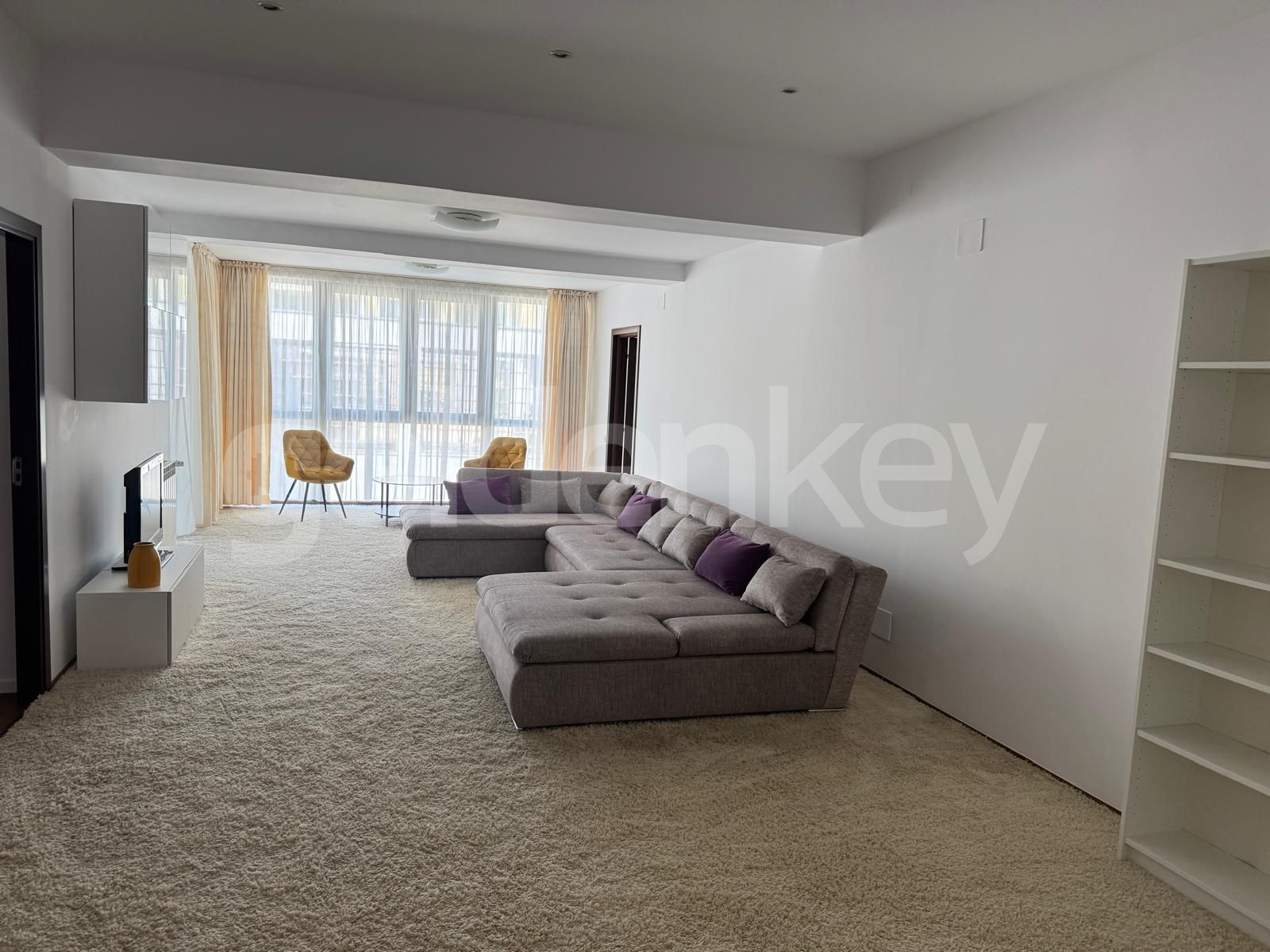 Este compus din hol generos, living de 44mp, bucatarie mobilata si complet echipata cu zona de dining si iesire pe balcon, dormitor matrimonial cu baie proprie si dormitor secundar cu baie secundara.