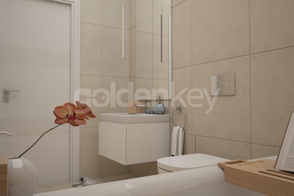 Este compus din living spatios cu zona de dining si iesire pe terasa, bucatarie inchisa, dormitor matrimonial cu baie proprie, dormitor secundar si baie secundara.