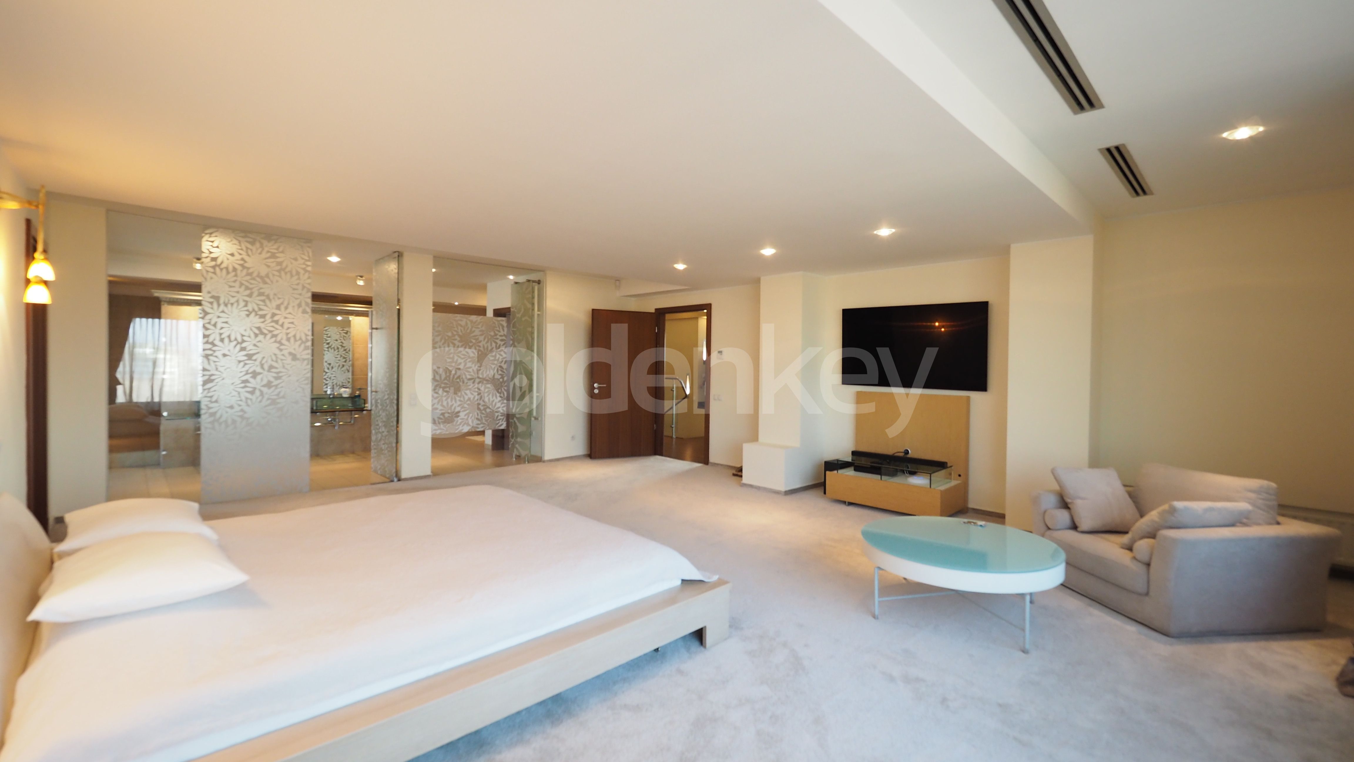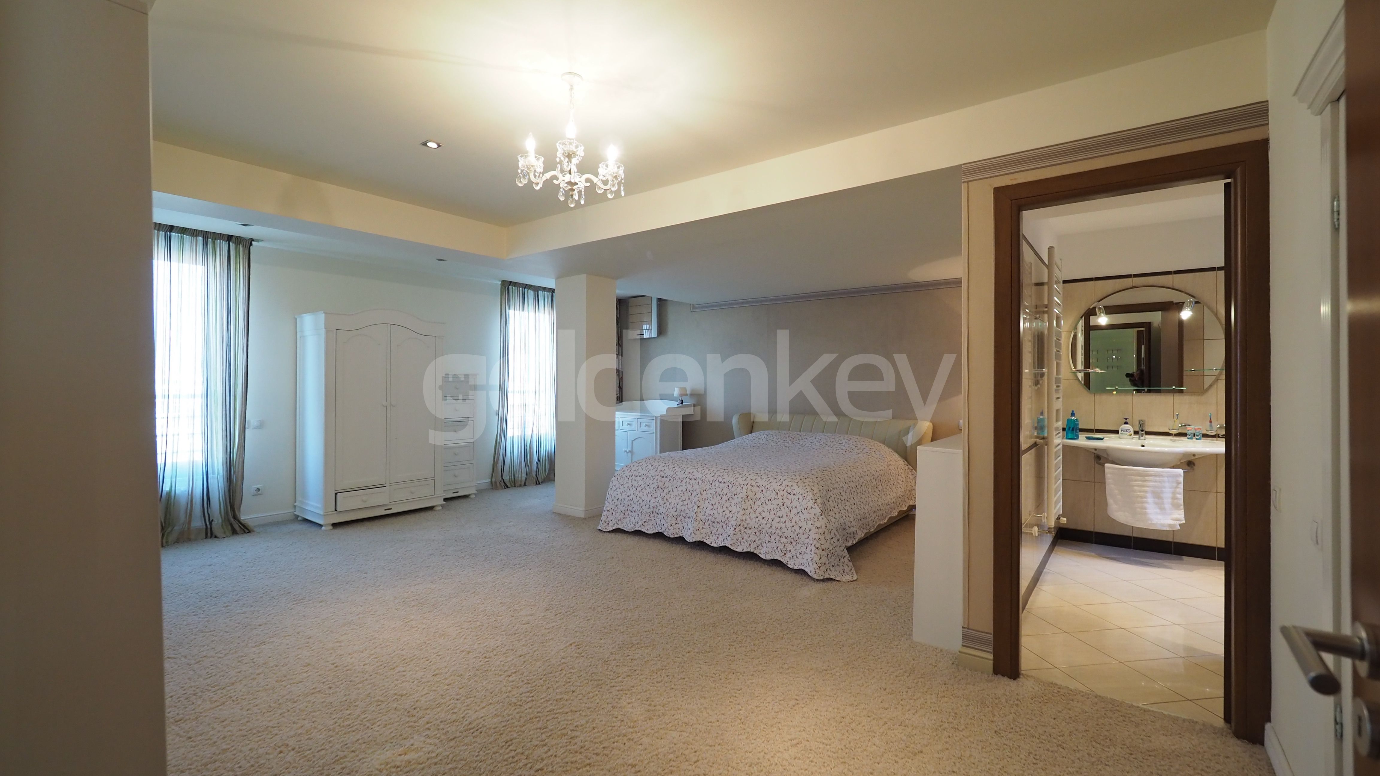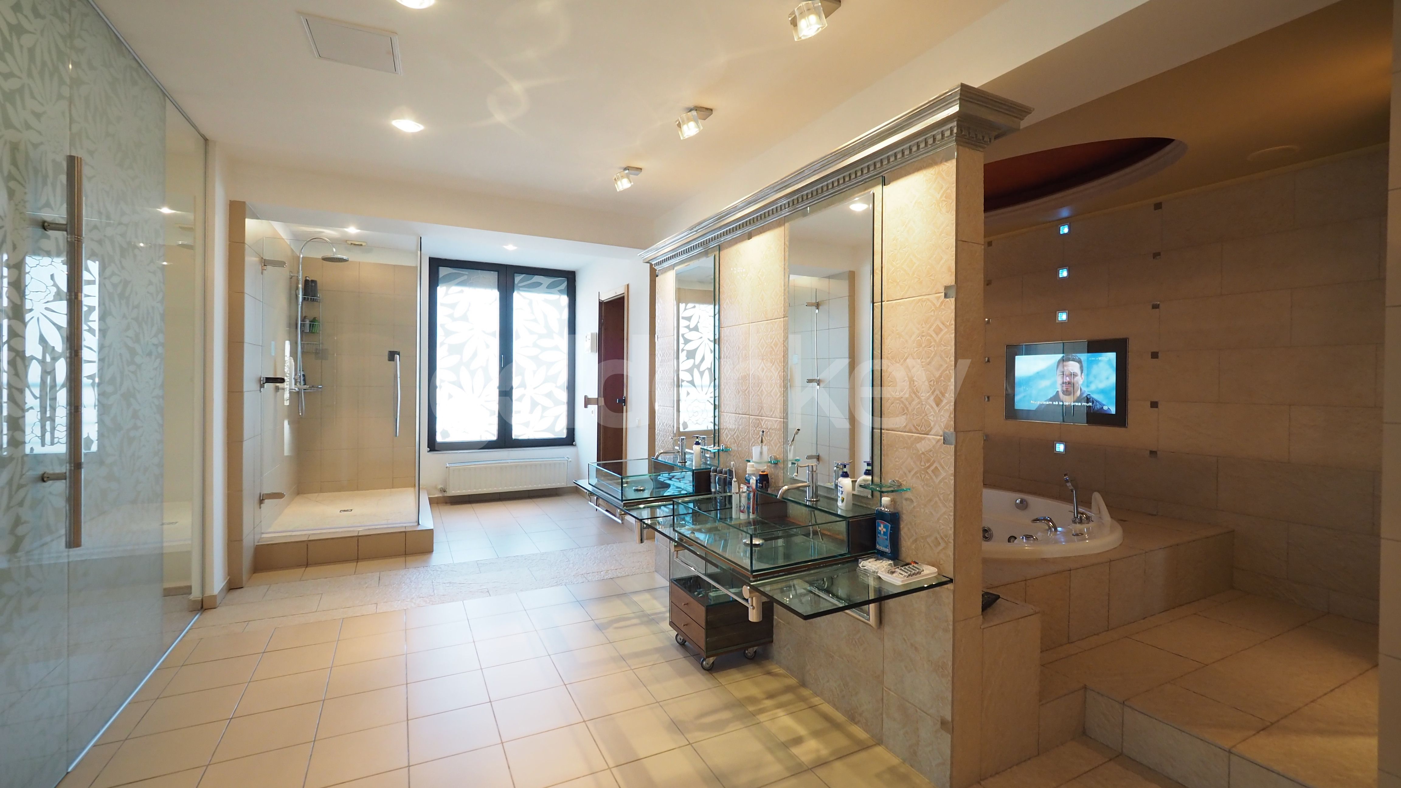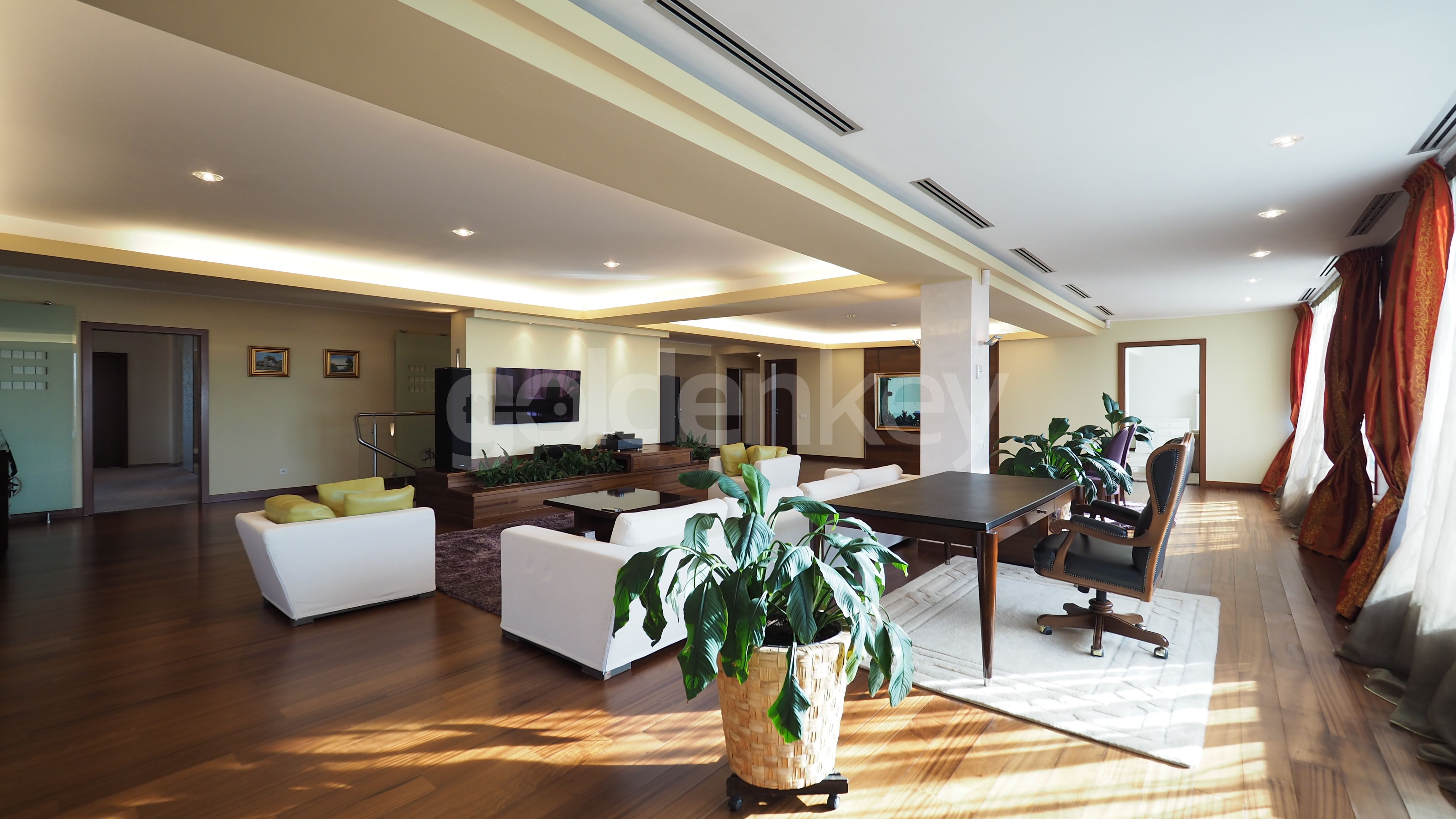 Este compus din living insorit cu zona de dining si semineu (169mp), bucatarie echipata, grup sanitar, dormitor matrimonial cu 2 dressing-uri si baie proprie cu sauna si Jacuzzi, 2 dormitoare secundare cu bai proprii, dormitor 3, baie cu dus si spalatorie.