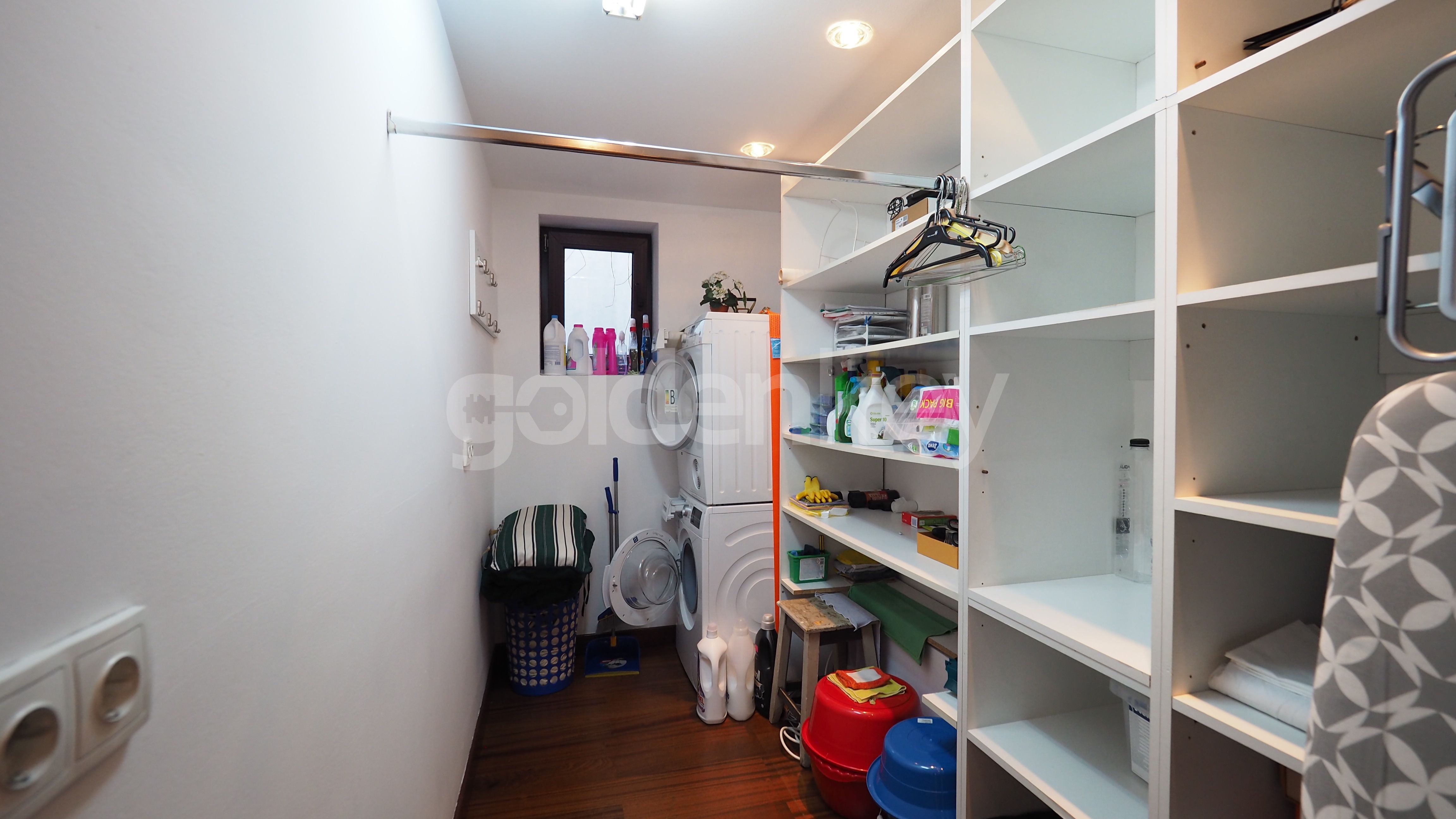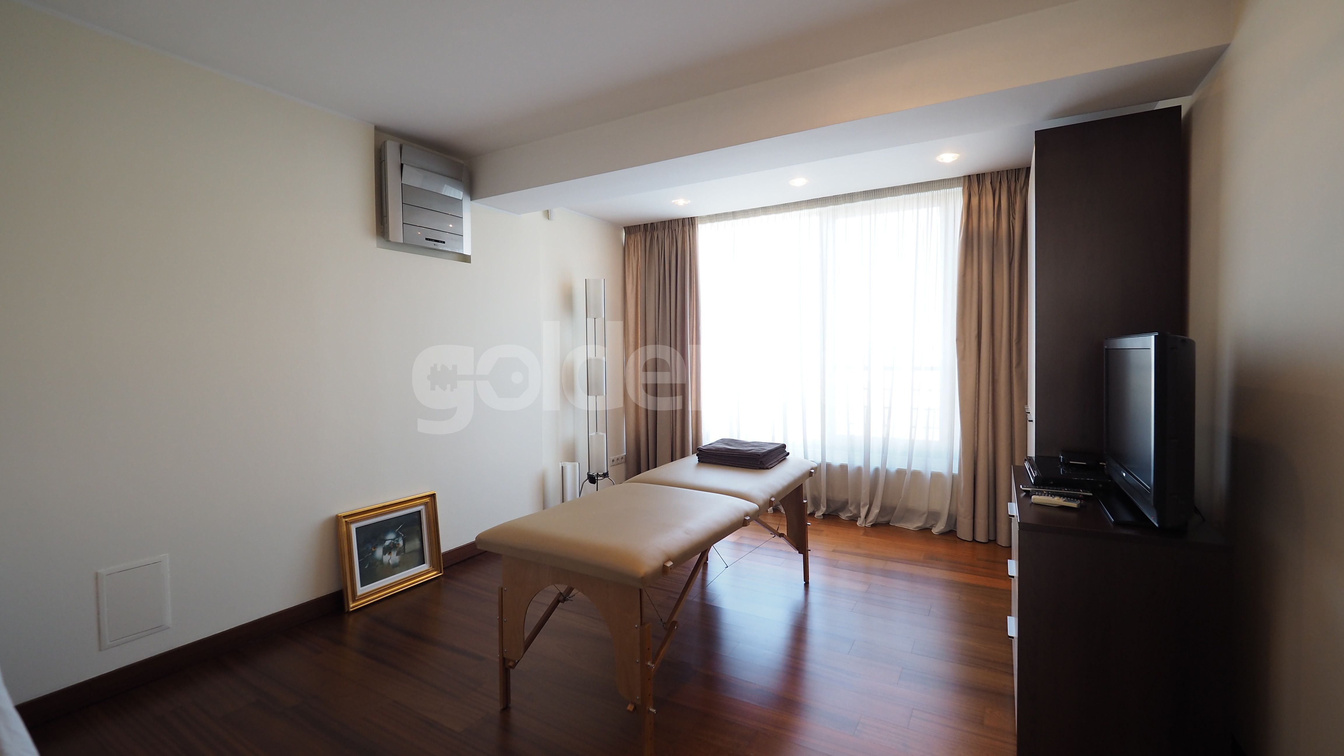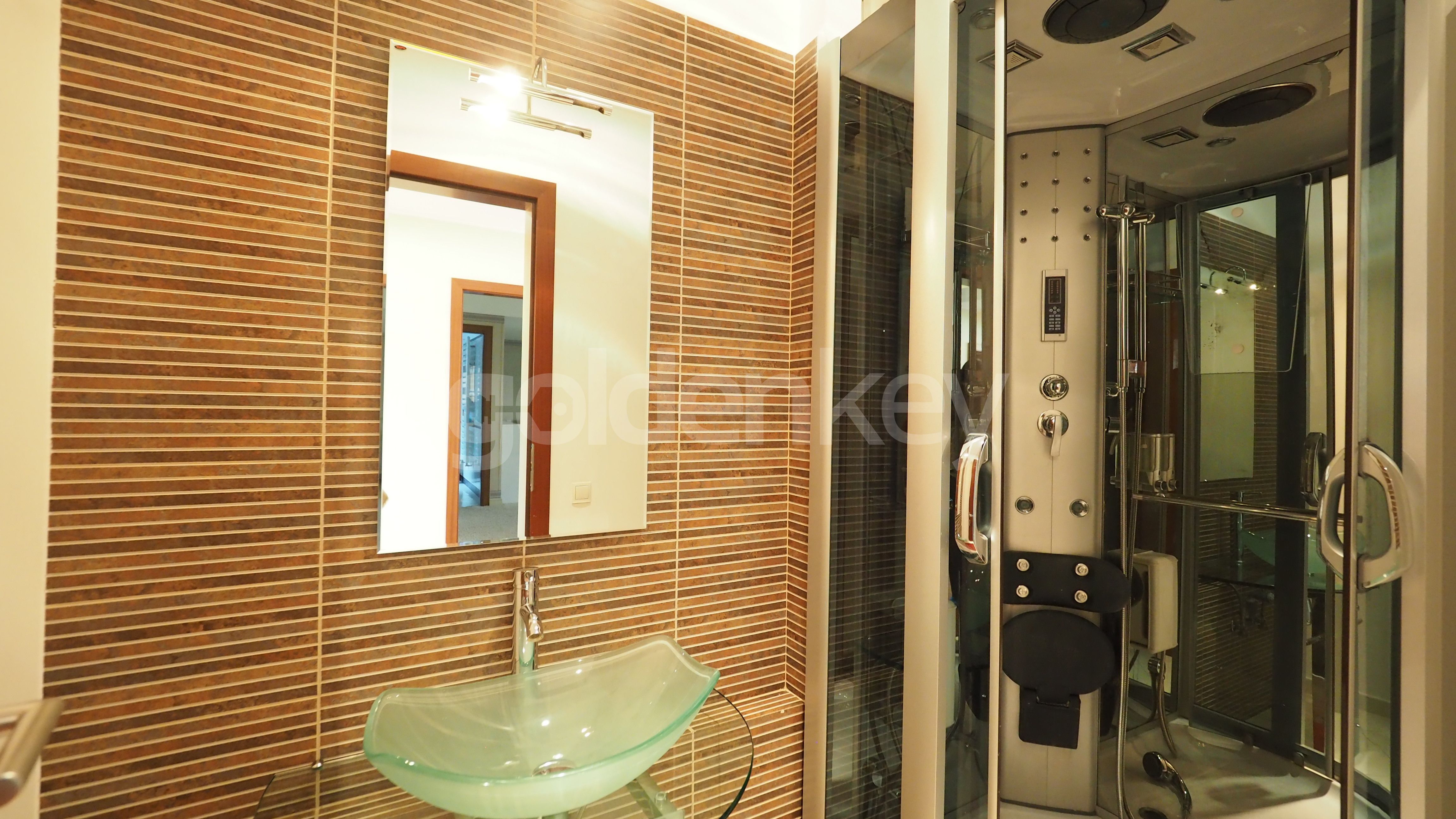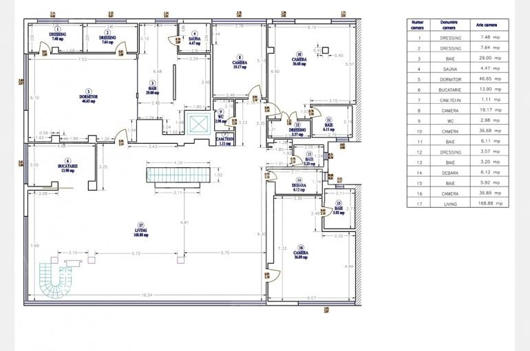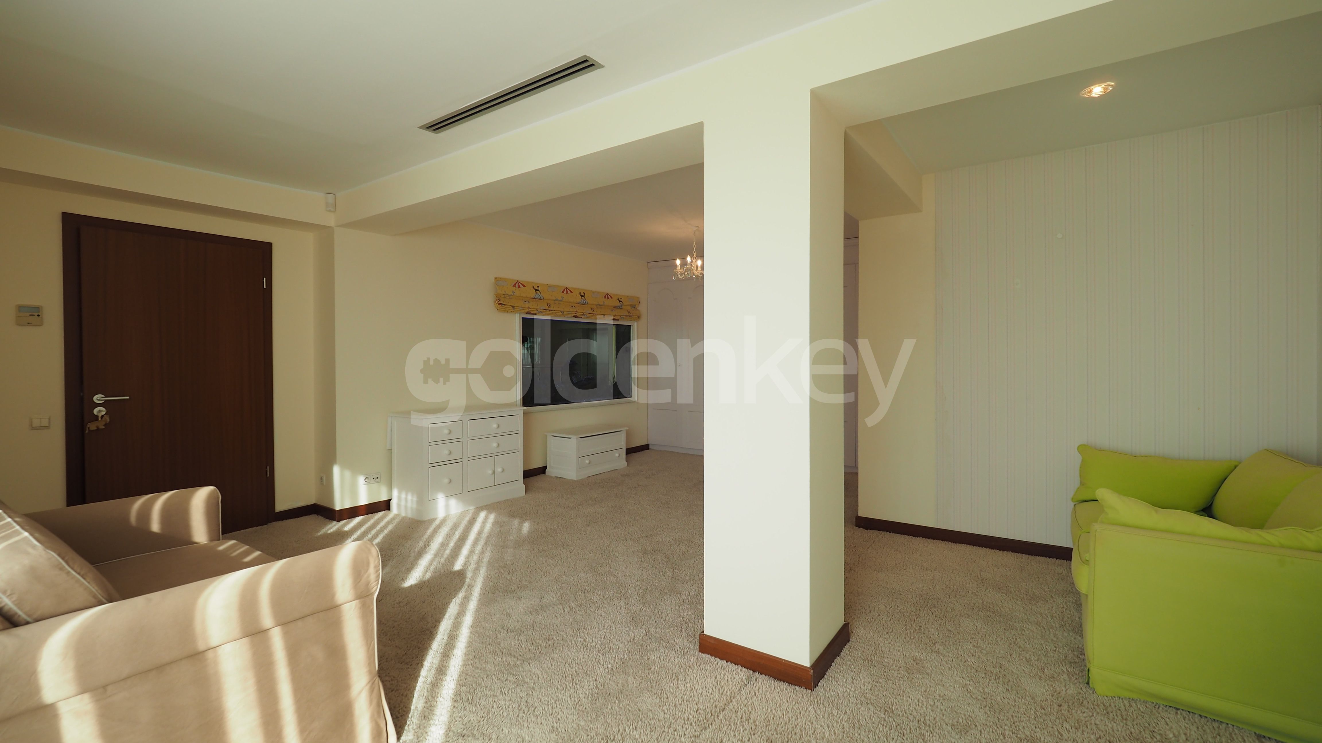 Este compus din living insorit cu zona de dining si semineu (169mp), bucatarie echipata, grup sanitar, dormitor matrimonial cu 2 dressing-uri si baie proprie cu sauna si Jacuzzi, 2 dormitoare secundare cu bai proprii, dormitor 3, baie cu dus si spalatorie.
