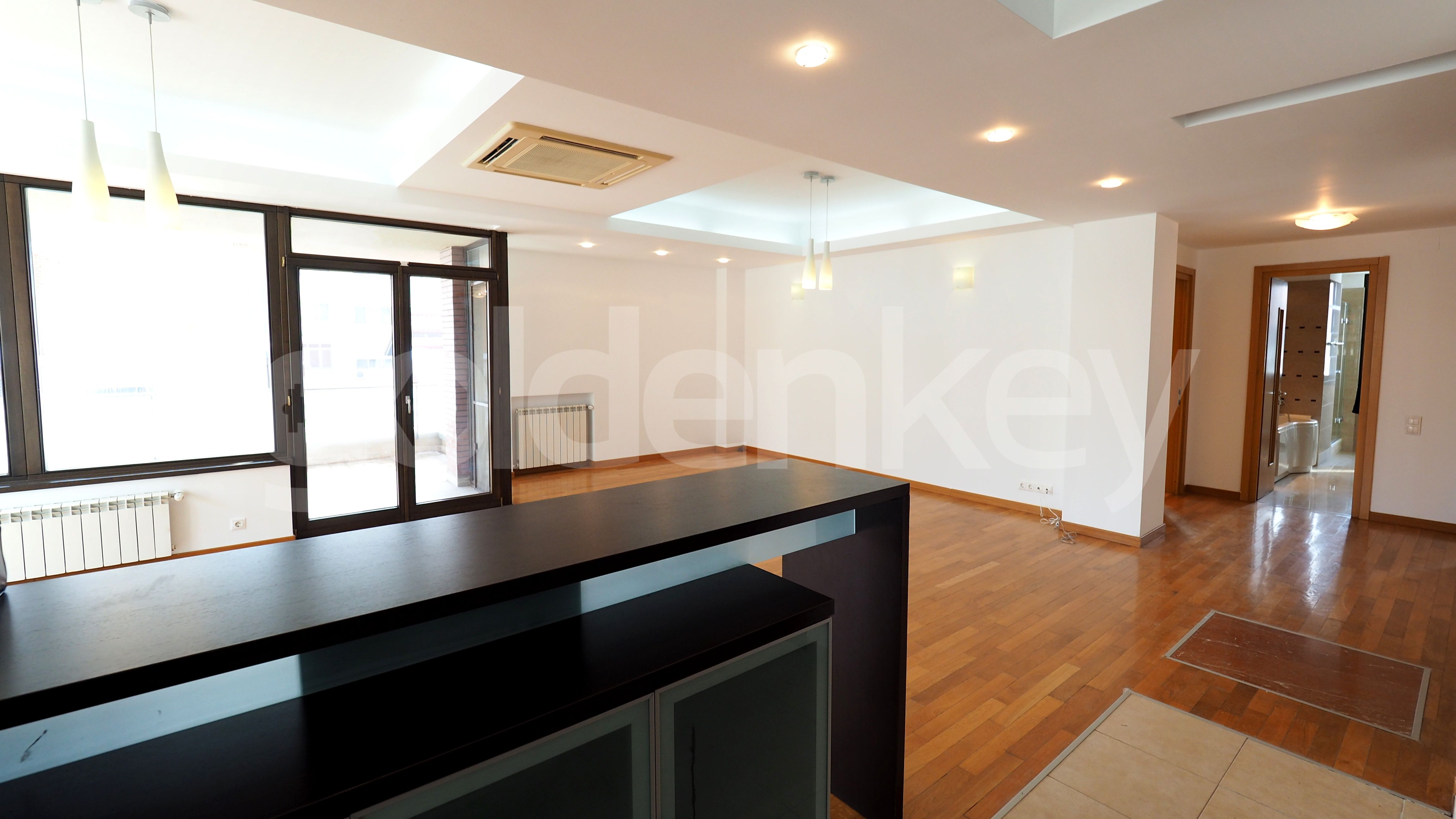 Este compus din living generos cu zona de dining, bucatarie deschisa 10mp (poate fi inchisa) complet mobilata si utilata, terasa insorita de 13mp, hol intrare, debara, dormitor oaspeti/birou 14mp, dormitor secundar de 17mp cu balcon 4mp, baie secundara cu cada si dus, plus dormitor matrimonial (17mp) cu baie proprie.