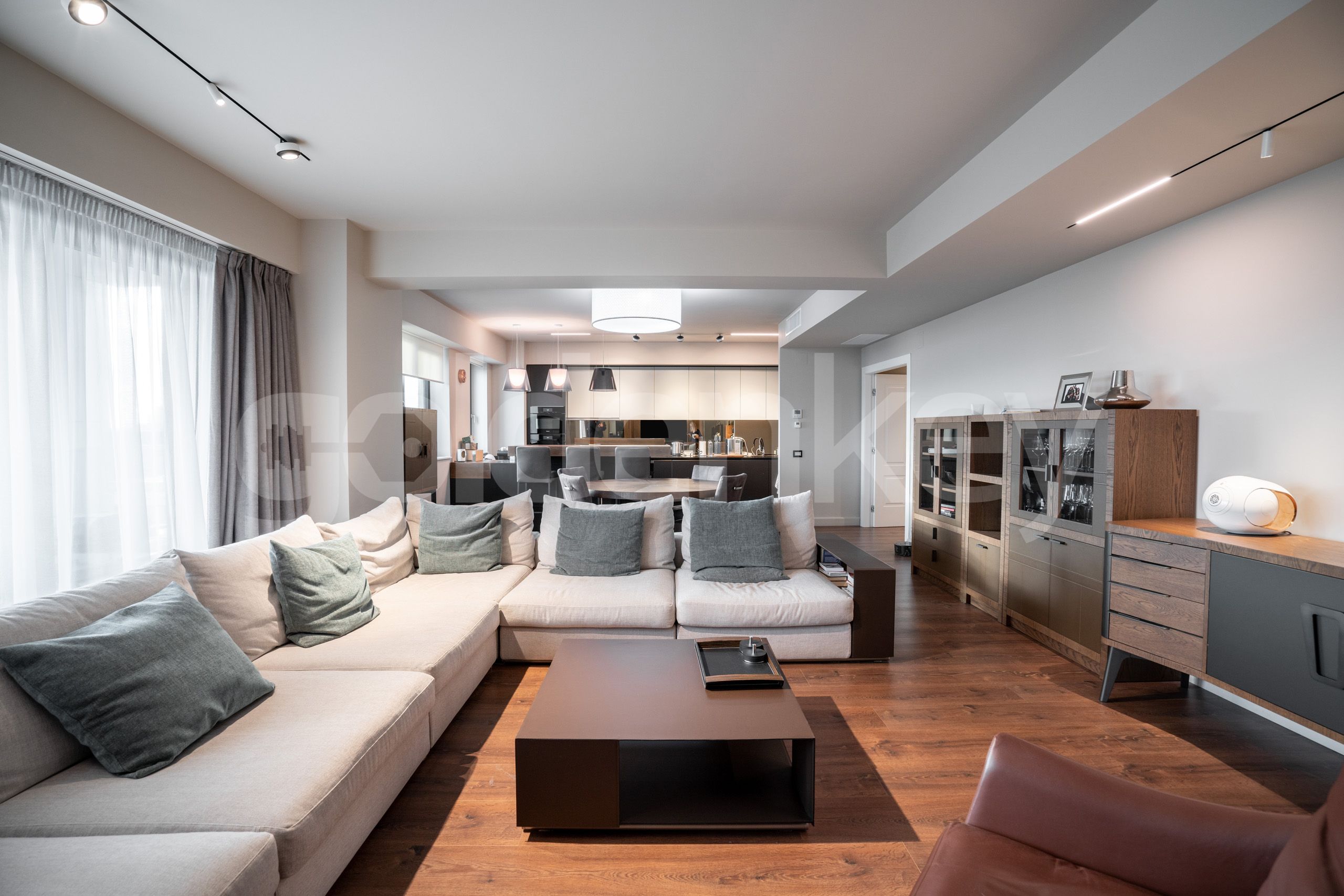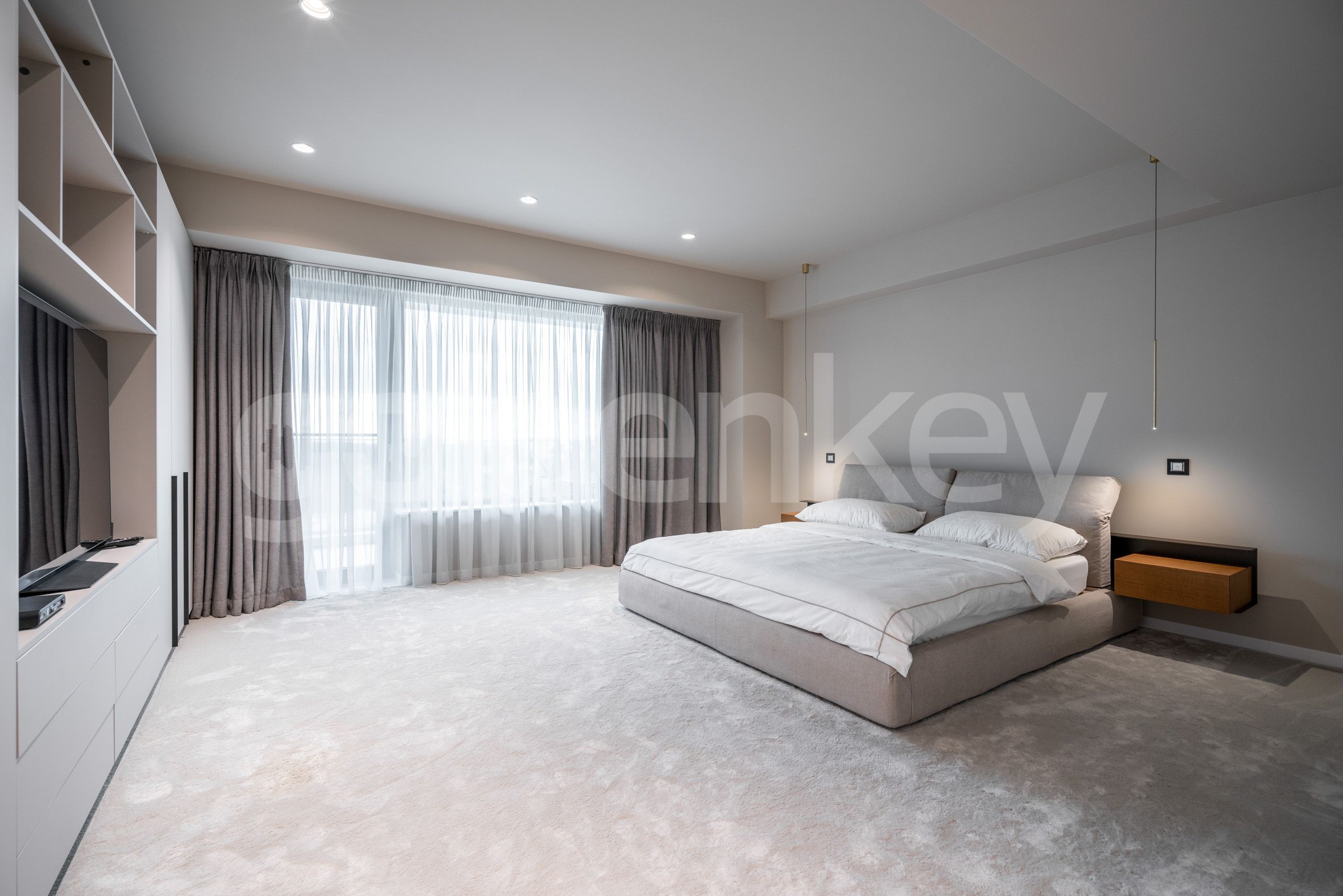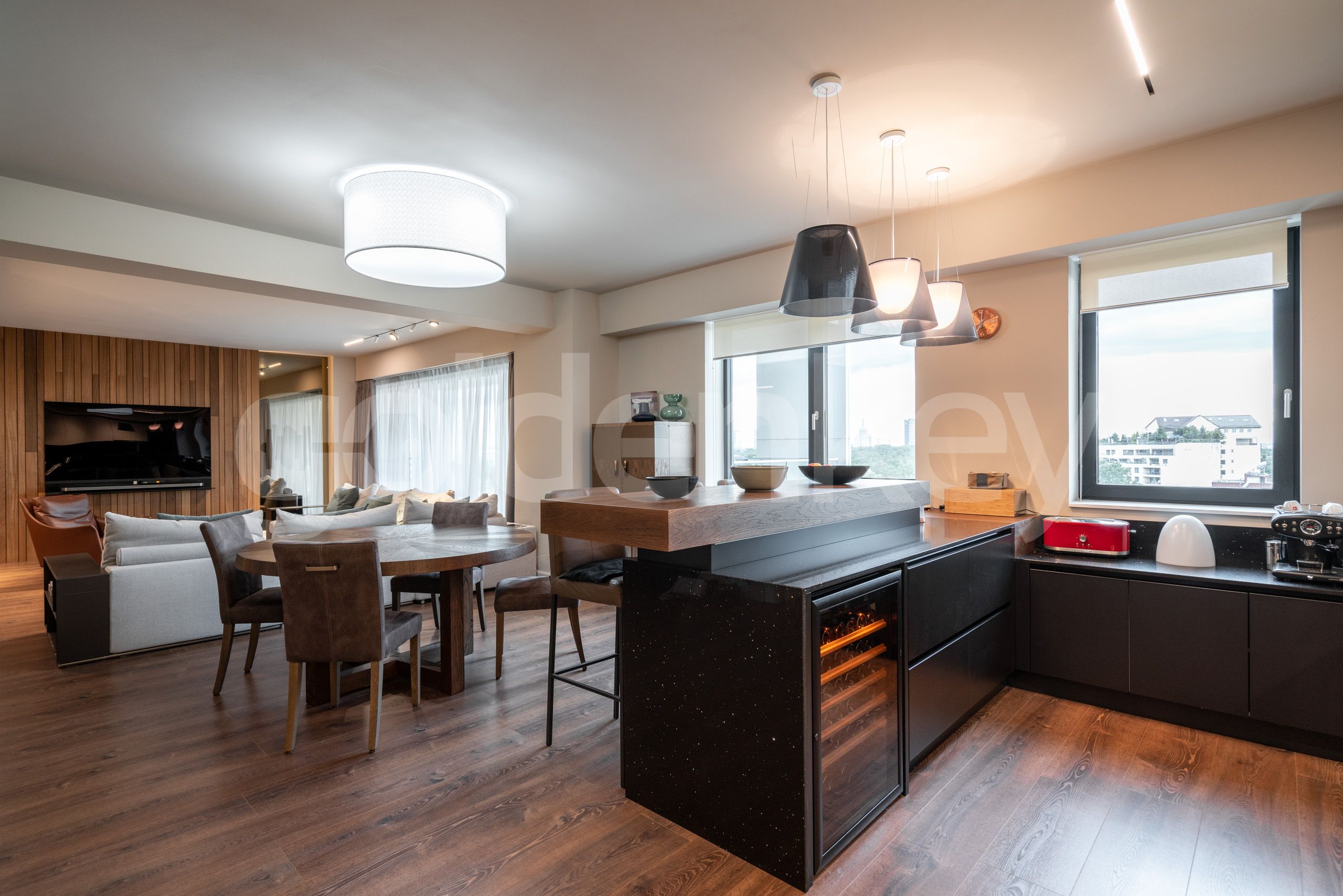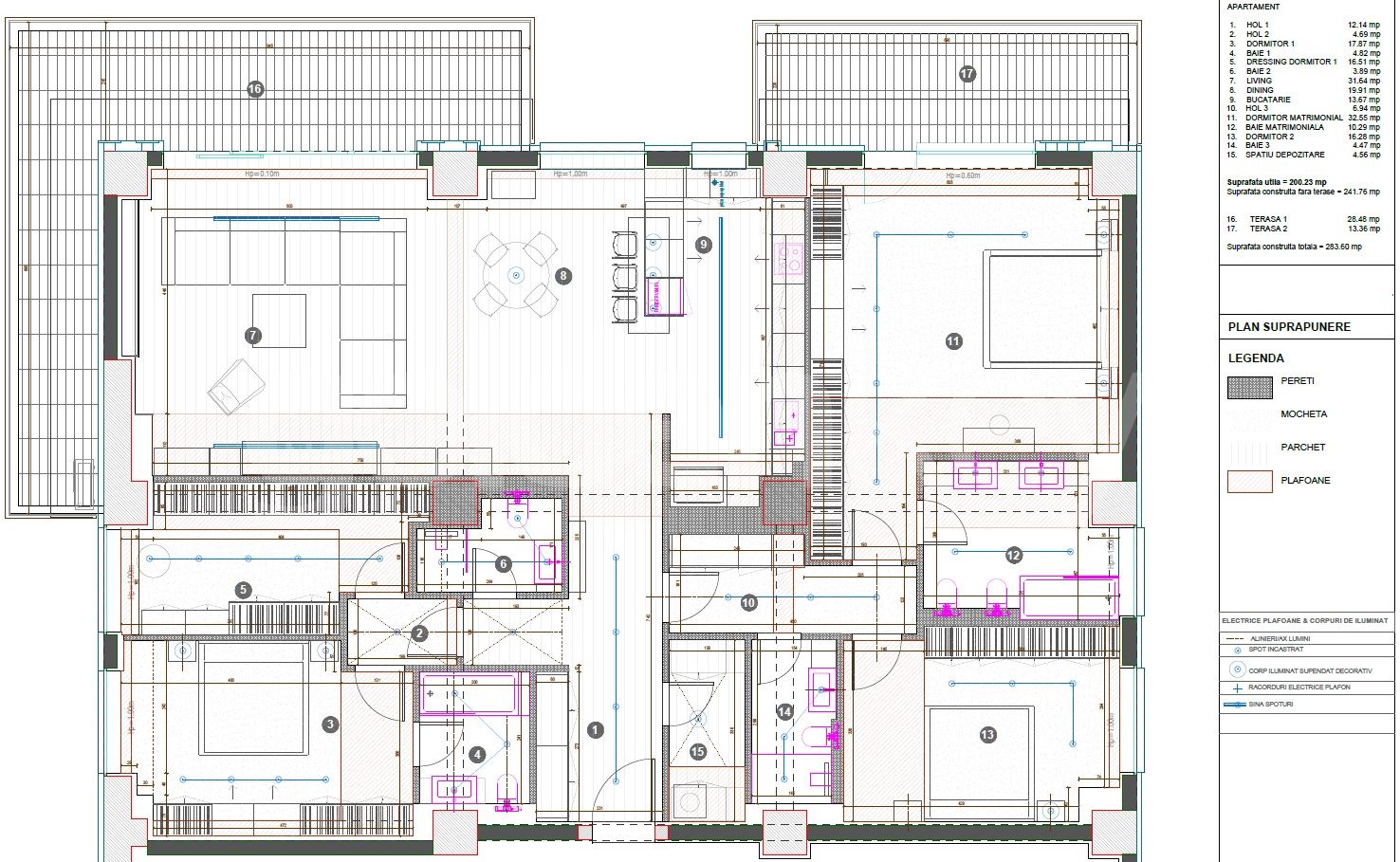 Este compus din zona de zi ampla de 51mp, terasa, bucatarie 15mp, dormitor matrimonial 33mp, terasa si baie en-suite si 3 dormitoare secundare (16/17/18mp) cu 3 bai.