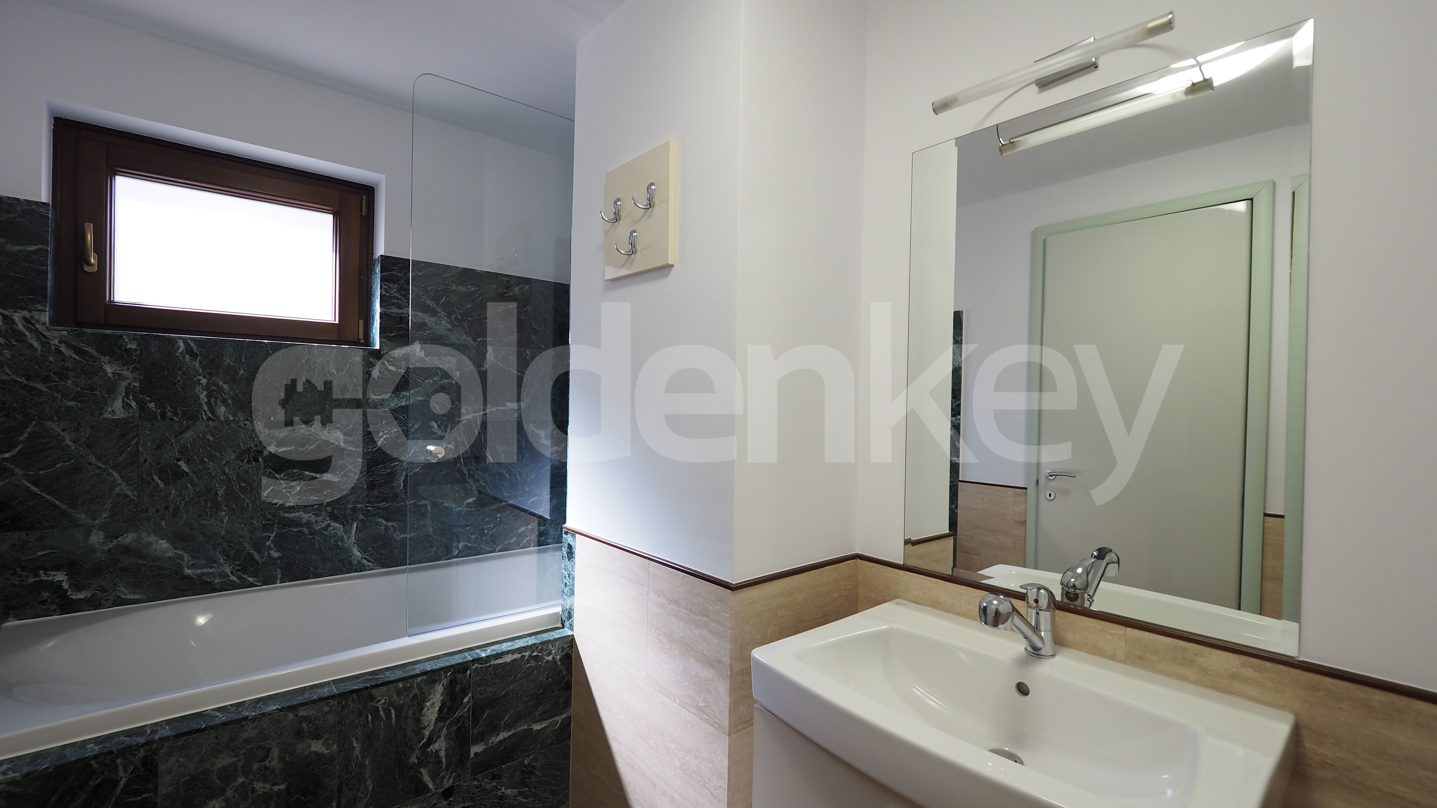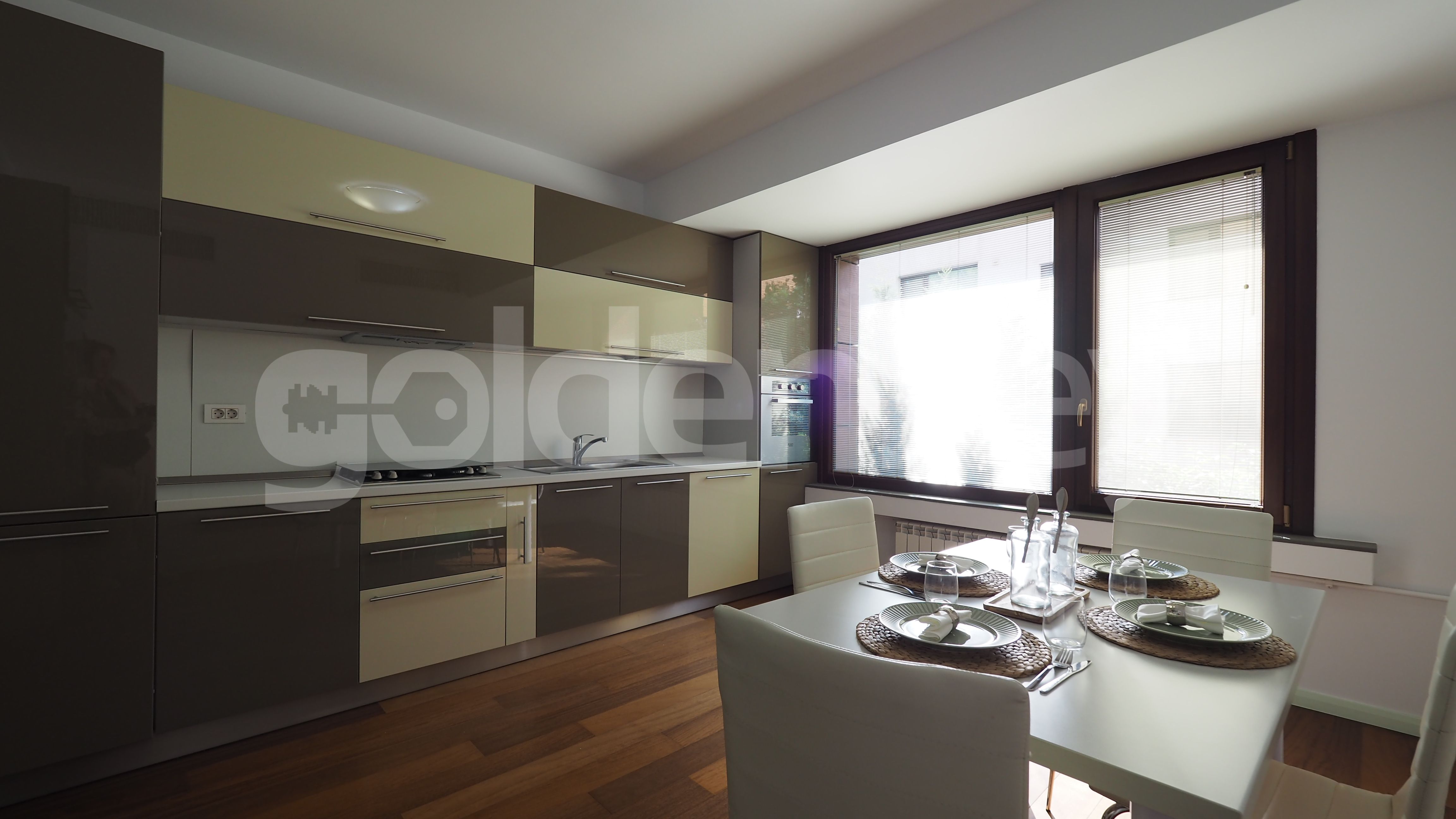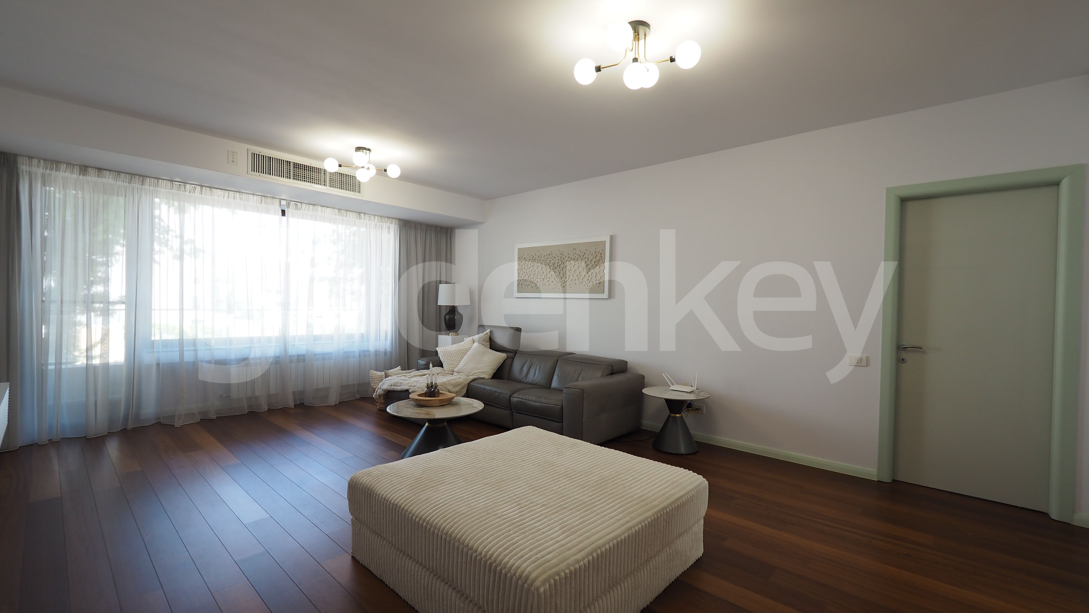 Este compus din zona de living cu suprafete mari vitrate si acces catre terasa, bucatarie moderna complet echipata, grup sanitar si loc de depozitare, dormitor matrimonial cu baie si un al doilea dormitor cu baie si dressing.