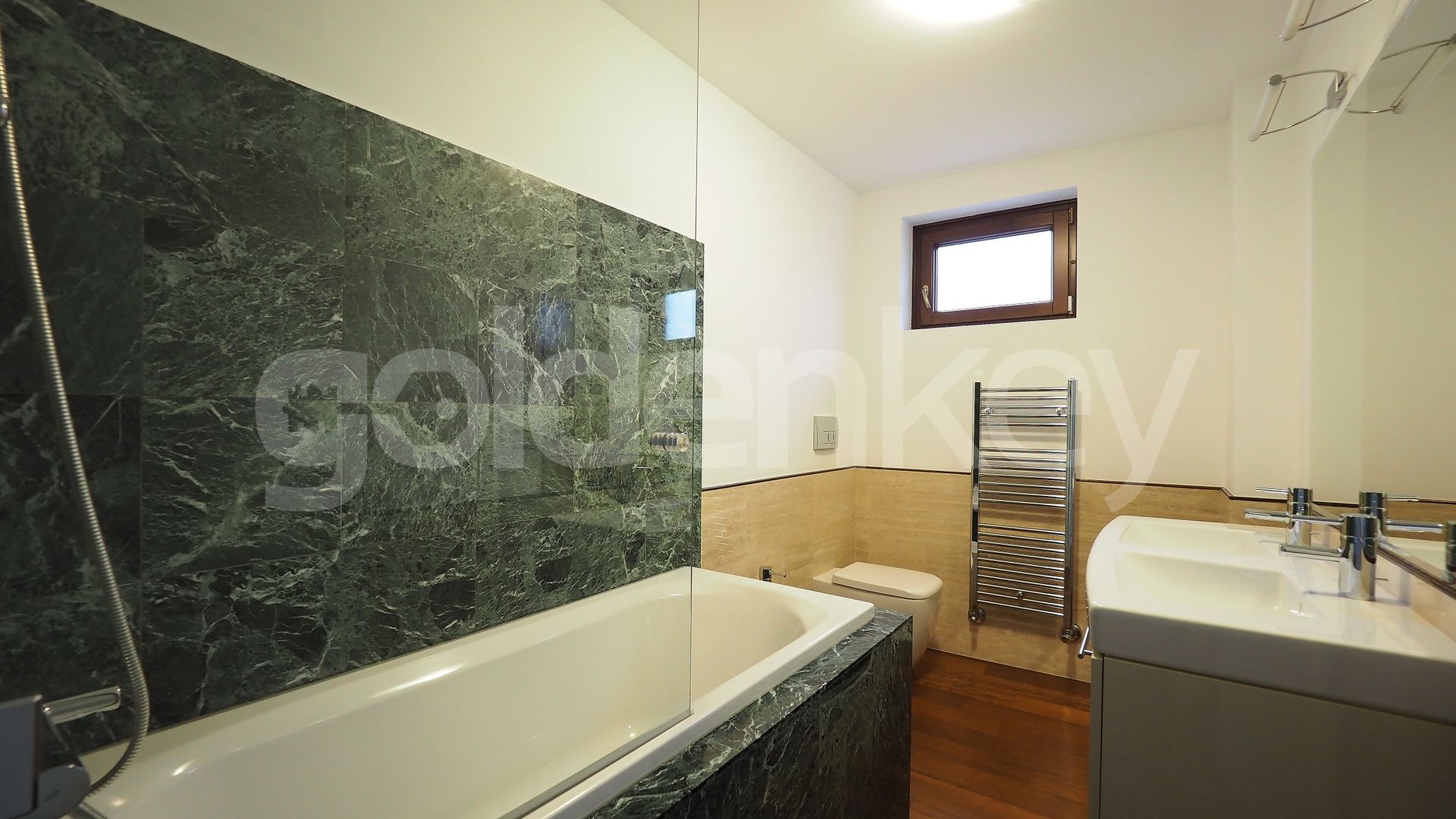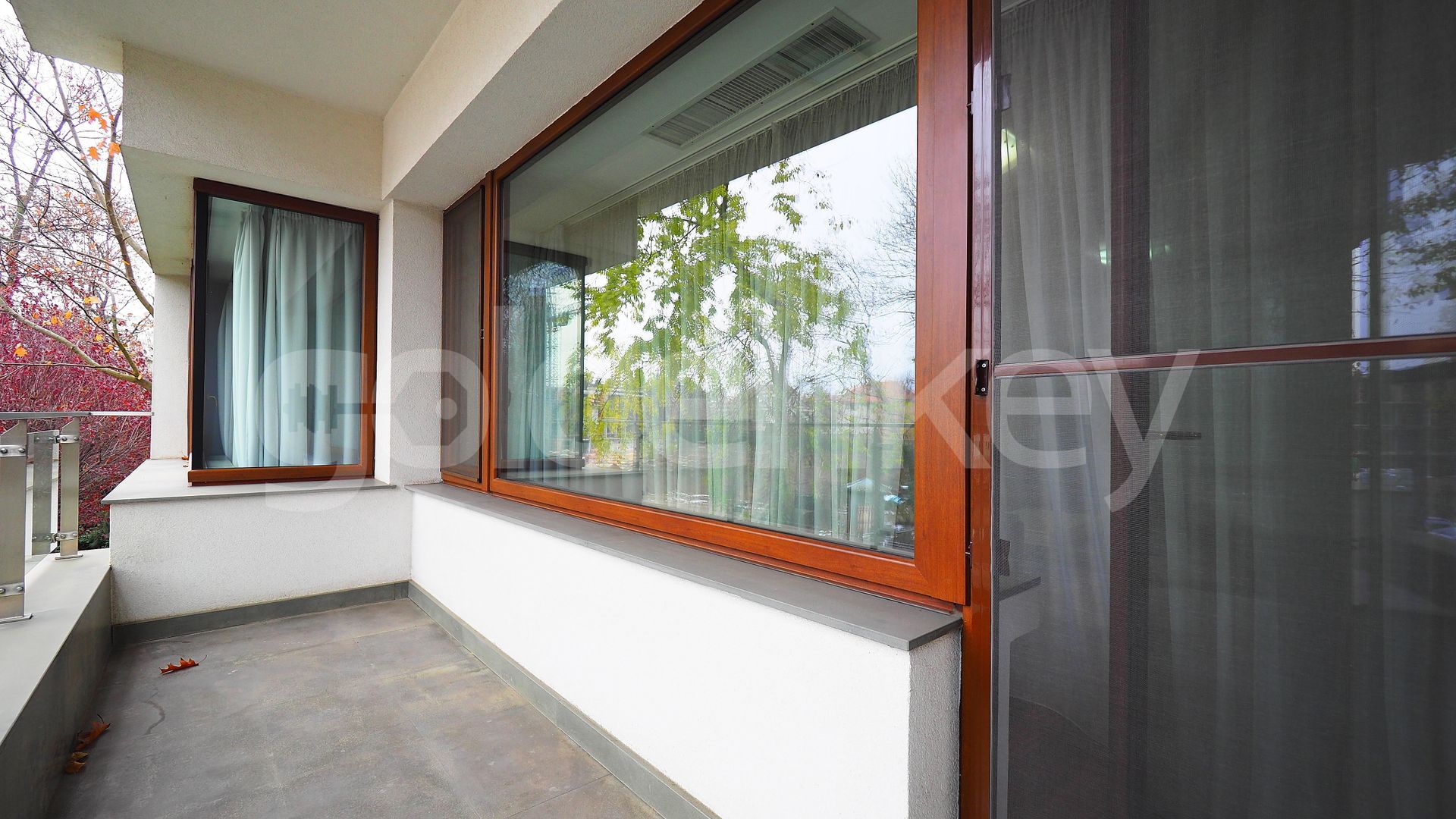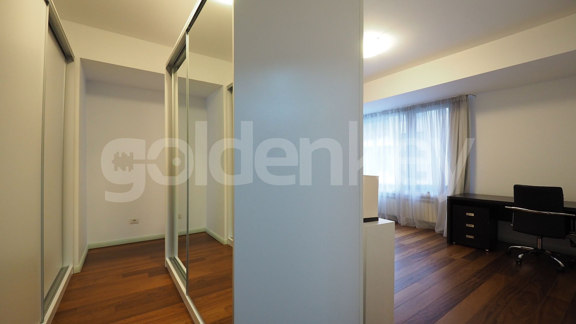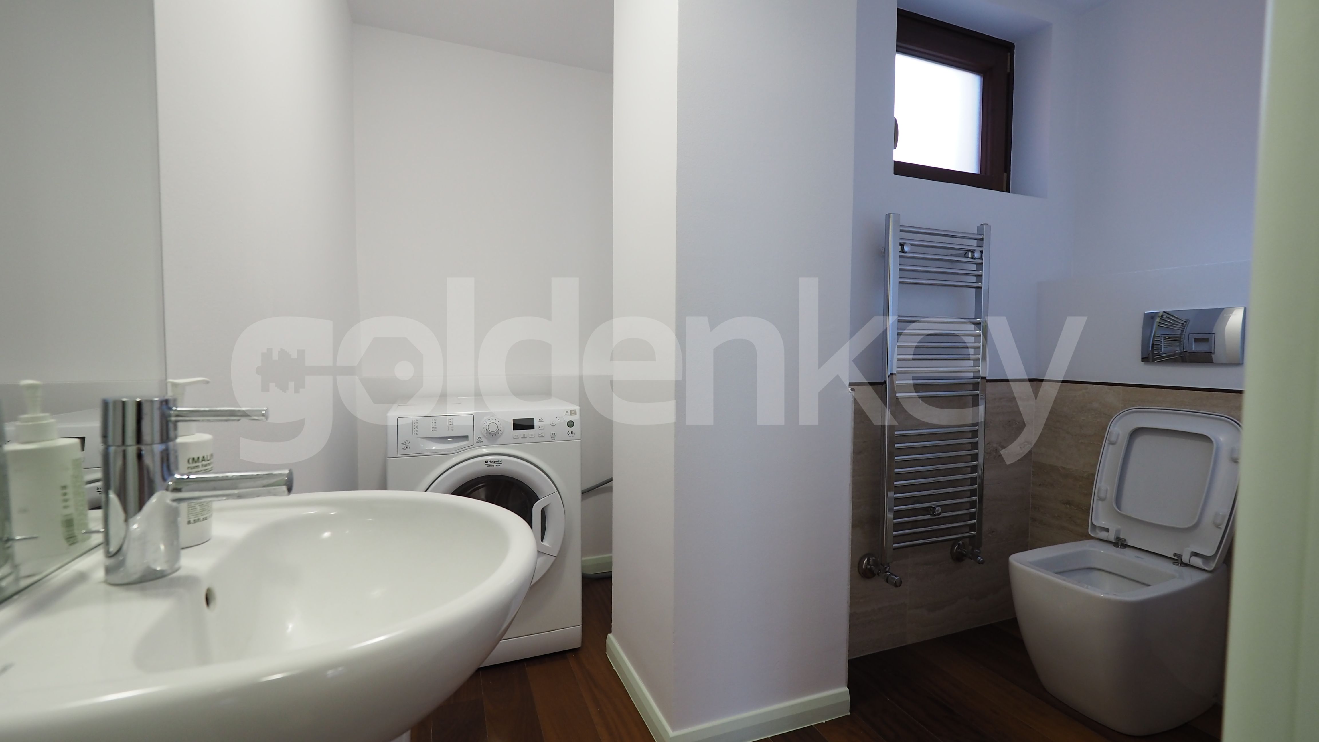 Este compus din zona de living cu suprafete mari vitrate si acces catre terasa, bucatarie moderna complet echipata, grup sanitar si loc de depozitare, dormitor matrimonial cu baie si un al doilea dormitor cu baie si dressing.