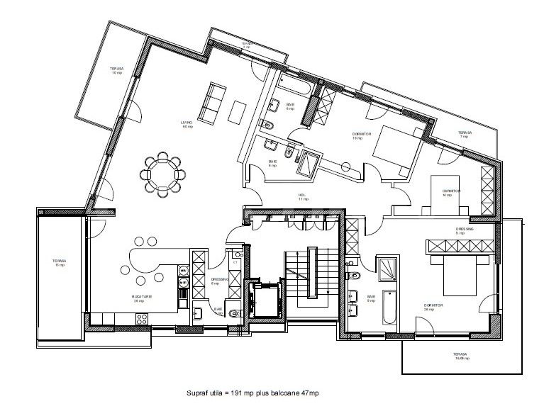 Are o suprafata totala de 250mp, din care 191mp utili si 47mp terase.