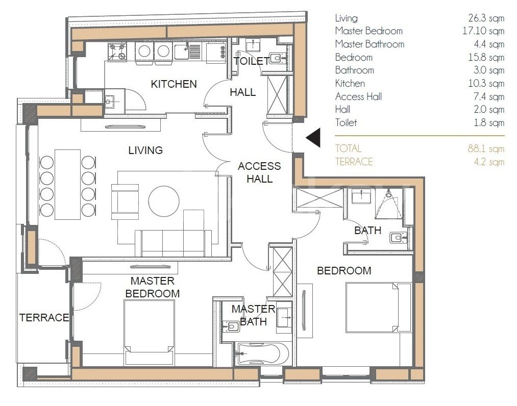 Este compus din living cu iesire pe balcon 4mp, bucatarie separata 10mp, grup sanitar, dormitor matrimonial cu baie proprie, dormitor secundar si baie secundara.